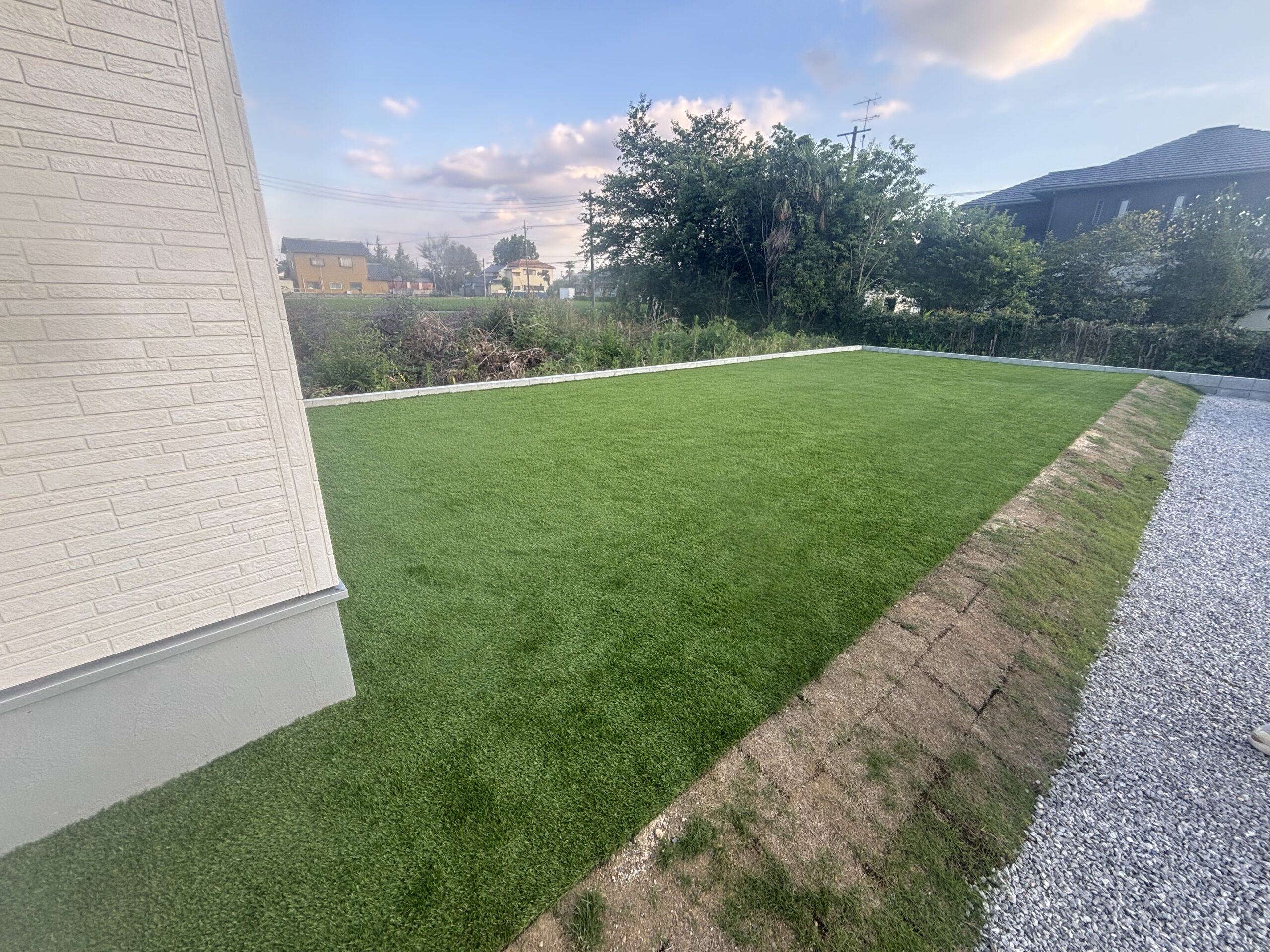 先日、新築のお庭にて人工芝を施行致しました。